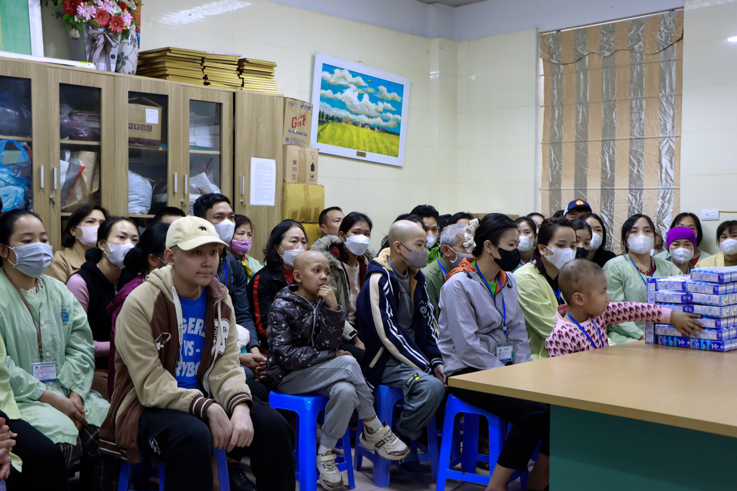 Tại bệnh viện, Đoàn thiện nguyện EVF đã thăm hỏi, lắng nghe những chia sẻ từ Phòng Công tác xã hội với số lượng bệnh nhi điều trị lớn trong thời gian dài, đòi hỏi sự kiên trì và kinh phí lớn. Đoàn cũng lắng nghe chia sẻ từ đại diện các gia đình bệnh nhi, bố hoặc mẹ các em phải luân phiên ở tại bệnh viện để chăm sóc con hàng ngày, nên gia đình chỉ còn một lao động lo kinh tế gia đình, vì thế khó khăn càng chồng chất thêm. Đoàn cũng thăm hỏi, chia sẻ, động viên các gia đình và gửi gắm những lời chúc bình an, nghị lực đến các cháu trong hành trình điều trị bệnh.