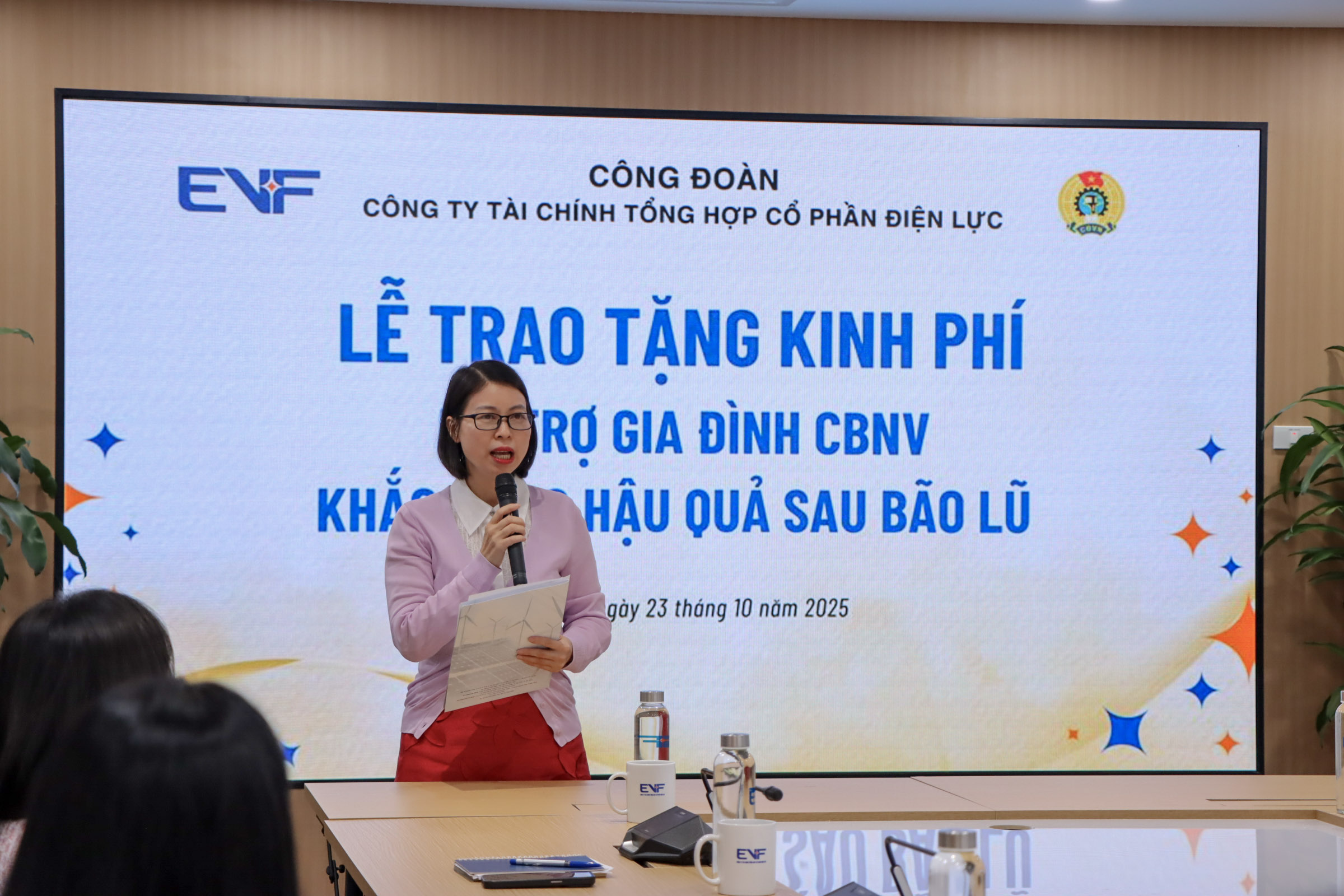 Chiều ngày 23/10, Ban chấp hành Công đoàn EVF tổ chức Lễ trao kinh phí hỗ trợ cho gia đình các CBNV bị ảnh hưởng bởi bão lũ. Tham dự buổi lễ có chị Nguyễn Thị Phương Thảo - Chủ tịch Công đoàn, chị Trịnh Thị Hồng Lê - Phó Chủ tịch Công đoàn, cùng các anh/chị trong BCH, Tổ trưởng Tổ Công đoàn, đại diện lãnh đạo một số đơn vị và các công đoàn viên.