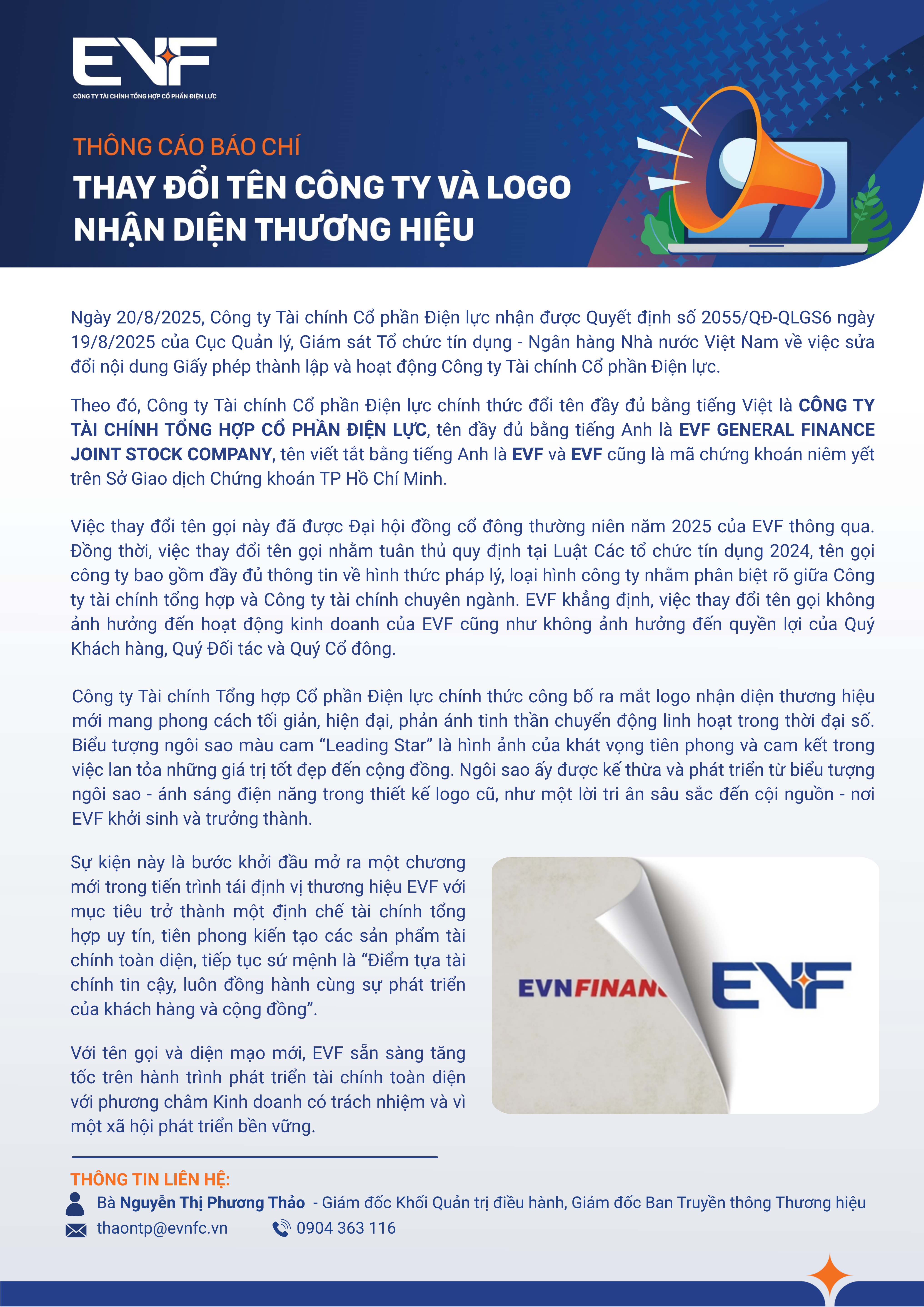 Việc thay đổi tên đã được Đại hội đồng cổ đông thường niên năm 2025 của EVF thông qua. Đồng thời, việc thay đổi tên gọi nhằm tuân thủ quy định tại Luật Các tổ chức tín dụng 2024. Tên gọi công ty bao gồm đầy đủ thông tin về hình thức pháp lý, loại hình công ty nhằm phân biệt rõ giữa Công ty tài chính tổng hợp và Công ty tài chính chuyên ngành.